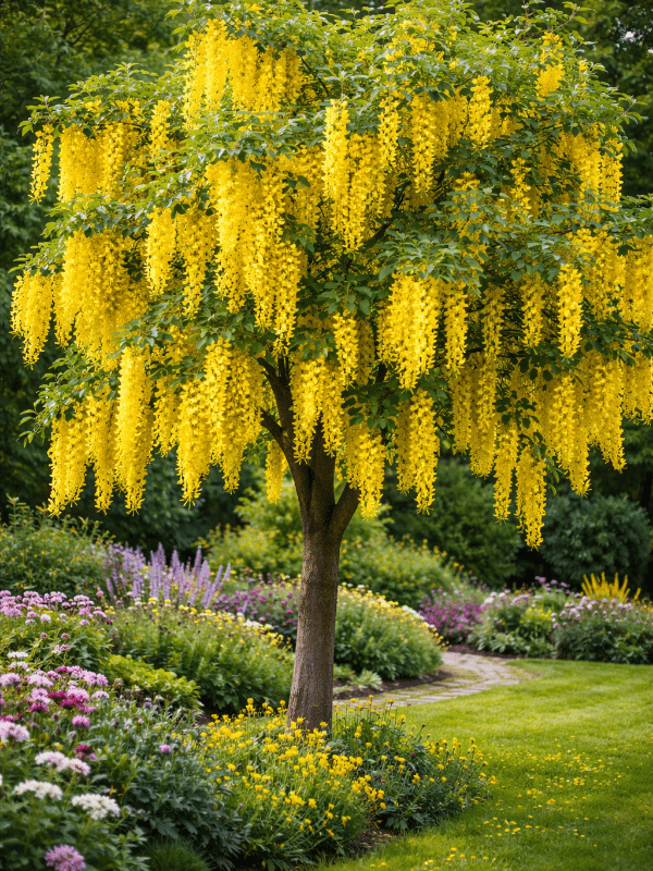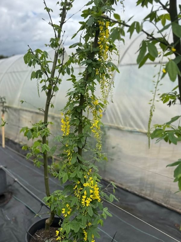 Laburnum × watereri ‘Vossii’ is a striking deciduous ornamental tree admired for its spectacular display of long, cascading yellow flower clusters in spring. The tree produces dense chains of bright golden blossoms that hang gracefully from the branches, creating a dramatic and eye-catching feature in the garden.